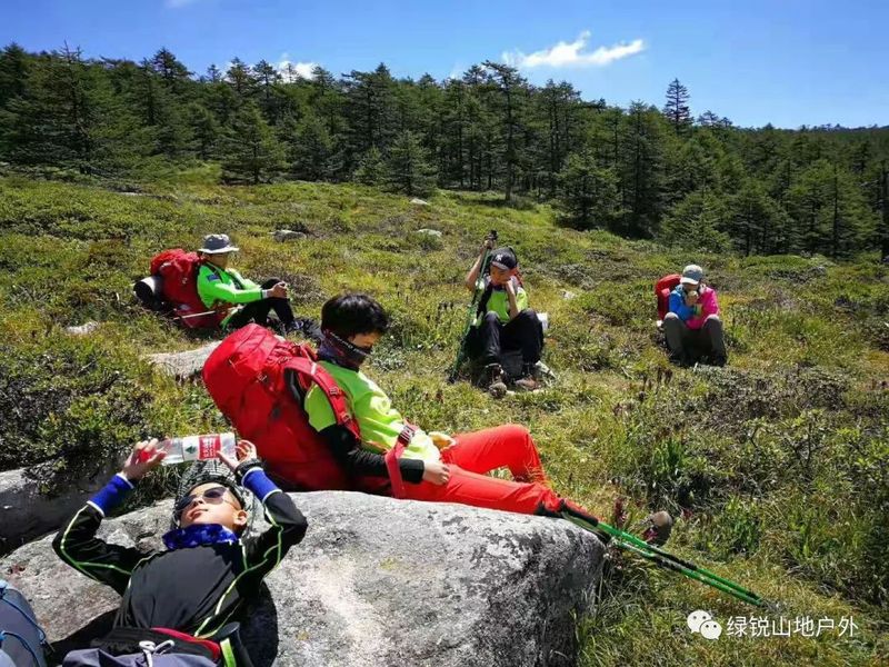 但前一夜高反的两名队员的状态却是很不好,在大家的的帮助下,虽然走的速度不快,但也没有更严重的情况出现。而女队员小邓就没有这么幸运了,随着海拔的继续升高,她的反应也越加的明显。很不容易的坚持到了第一个高山湖泊—玉皇池,这是中午的午餐地,而小邓一上午也基本上没有进食,在这也没有吃饭的胃口,然后在教练的坚持下,她也喝了一些麦片补充能量。但是在玉皇池往三爷海走的石海坡时,刚登上去,小邓就感觉难受需要坐下休息,结果刚坐下就趴在边上的草从里吐了。在后面也是不想再吃任何东西补充能量了。一路上小邓基本上走上几步就感觉到恶心想吐,走几步就要坐着缓解一下头痛。最后在大家的帮助下,小邓也是一步步的登上了三爷海、二爷海、三公台营地。